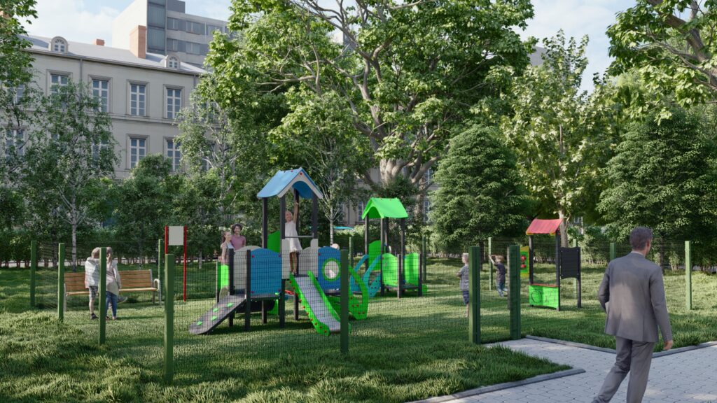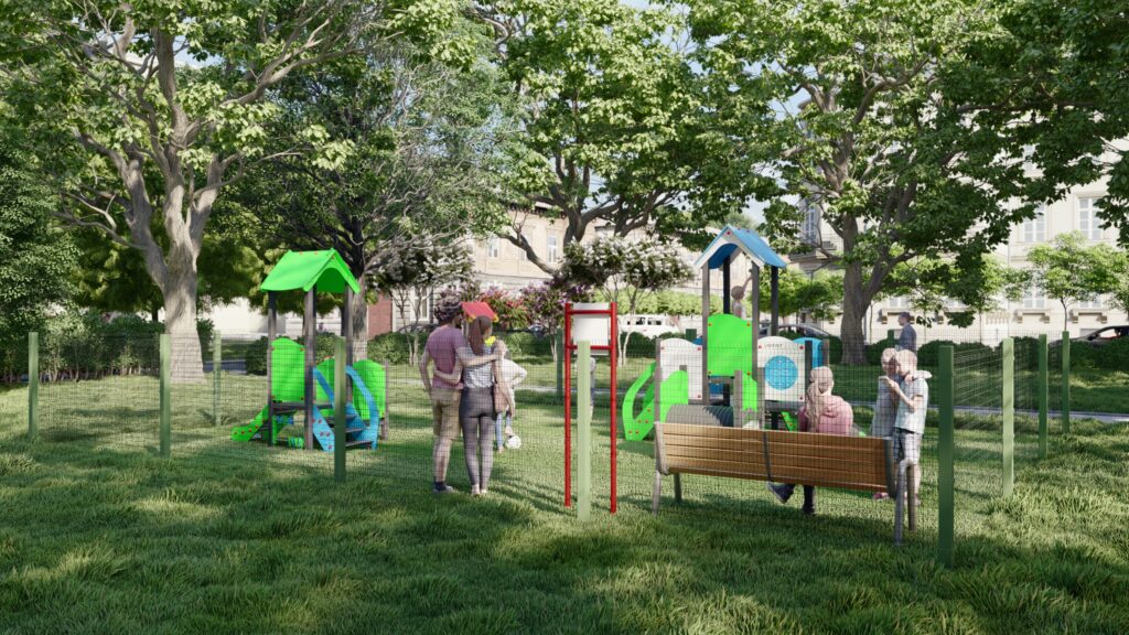 Przedstawiona wizualizacja placu zabaw to propozycja na działkę o powierzchni 11×8,5 m.