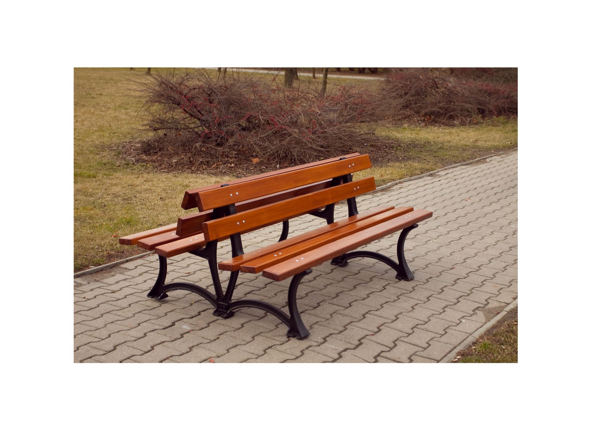 Podwójna ławka miejska żeliwno-drewniana. Świetnie sprawdza się w przestrzeni publicznej, np. w parku, nad jeziorem, przy alejce, na deptaku, czy na placu zabaw. Jest wyjątkowo mocna i stabilna. Klasyczny design sprawia, że ławka uliczna dobrze wkomponowuje się w każdą przestrzeń. Łatwo do niej dobrać pasujące kosze na śmieci, by utrzymać spójność elementów. Elementy drewniane ławki miejskiej dostępne są w dwóch wariantach kolorystycznych.