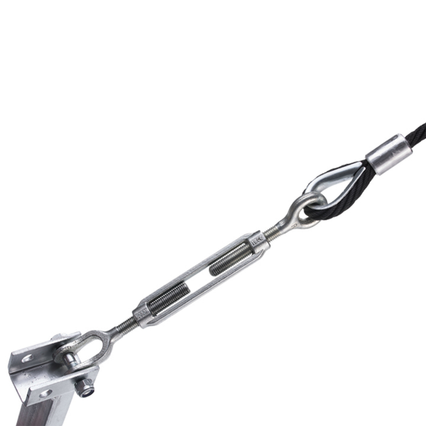 W zestawie klamry obrotowe, zestaw kotwic oraz słupek centralny. Piramidy linowe montuje się w betonie. Wysokość upadku jest równa wysokości najniższej liny (<1m).