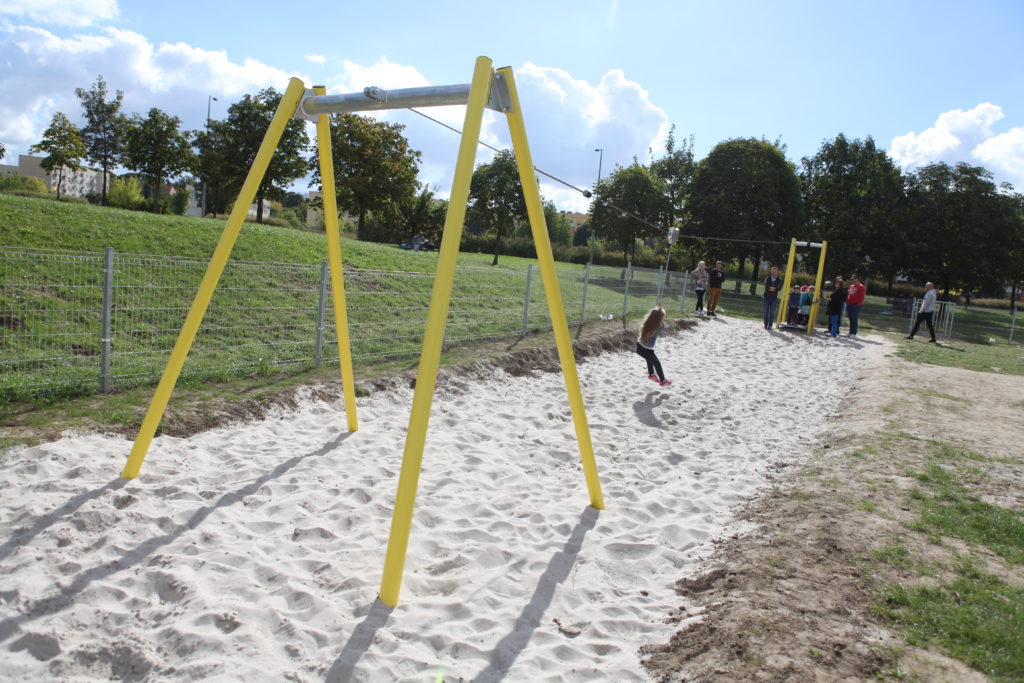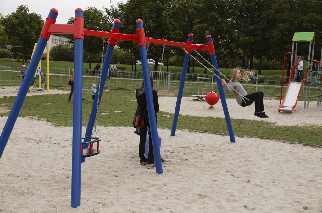 Na zdjęciach poniżej widać jak okoliczne dzieci opanowały już najnowszy plac zabaw Activeline. Chętnie bawią się one na zestawach zabawowych, huśtawkach wahadłowych, bujakach i w piaskownicy. Młodszym towarzyszą rodzice, a starsi dziarsko sami świetnie sobie radzą. Wszyscy chętnie odwiedzają domek w kształcie wagonu. Można w nim odpocząć, usiąść, pobawić się w podróż pociągiem, lub dzięki wyobraźni zmienić domek w każde inne miejsce.