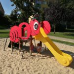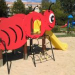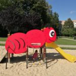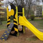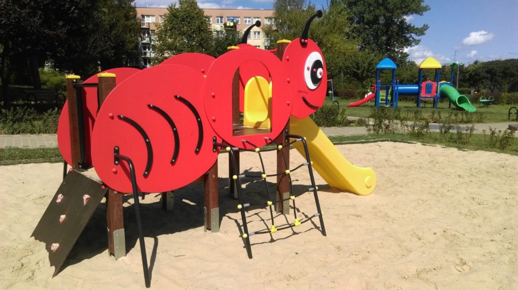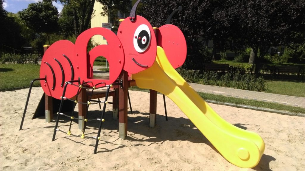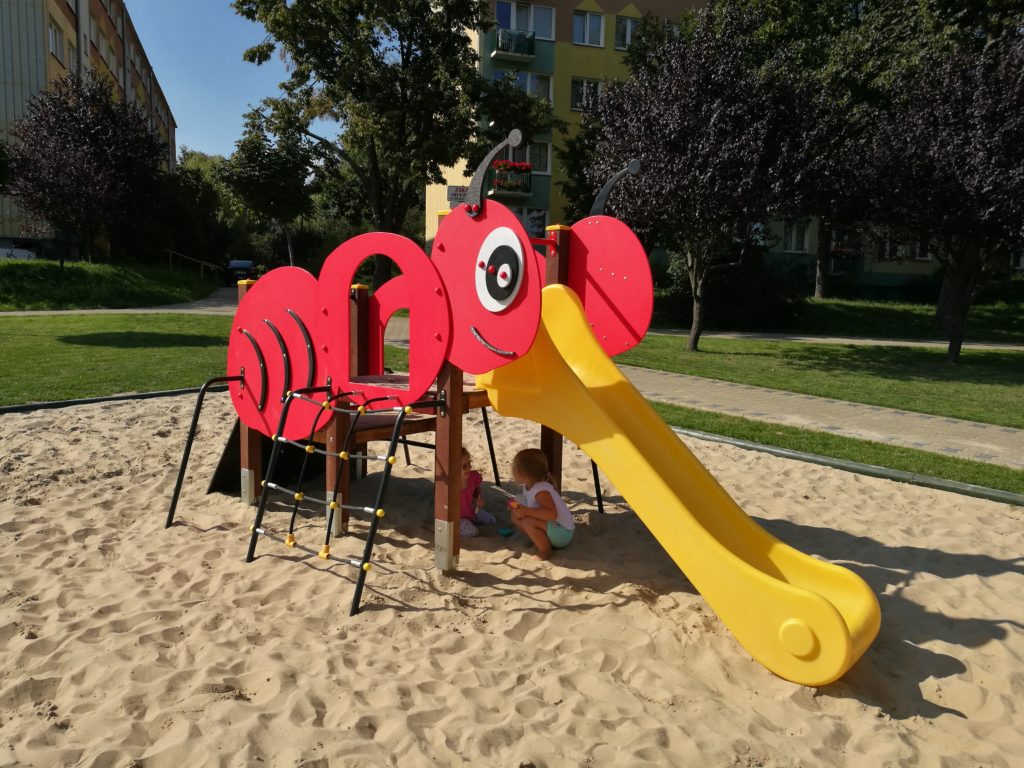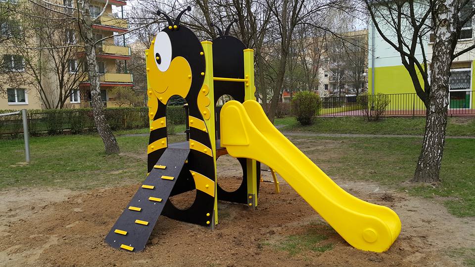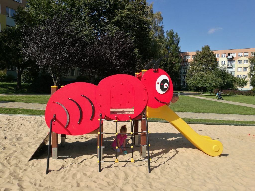 Plac zabaw w Kielcach opanowany przez wielkie owady! Na szczęście owady są zestawami zabawowymi w kształcie mrówki (zjeżdżalnia mrówka) i pszczoły. W dodatku są uwielbiane przez dzieci. Nie ma malucha, który oprze się zabawie na barwnym urządzeniu.