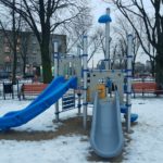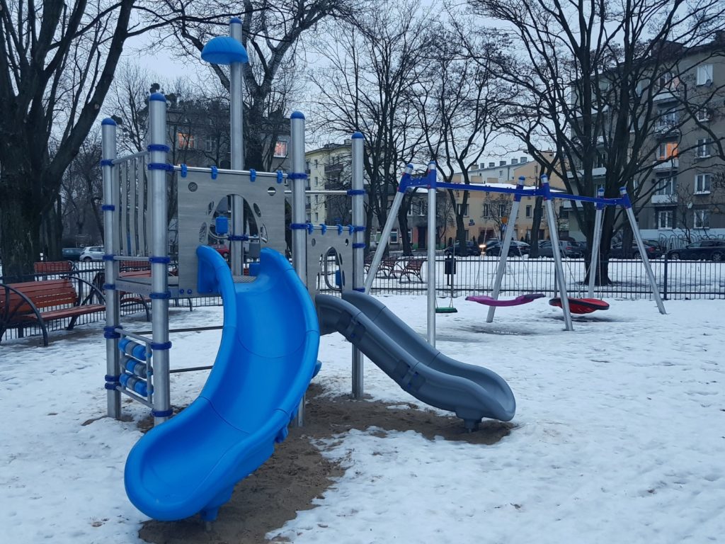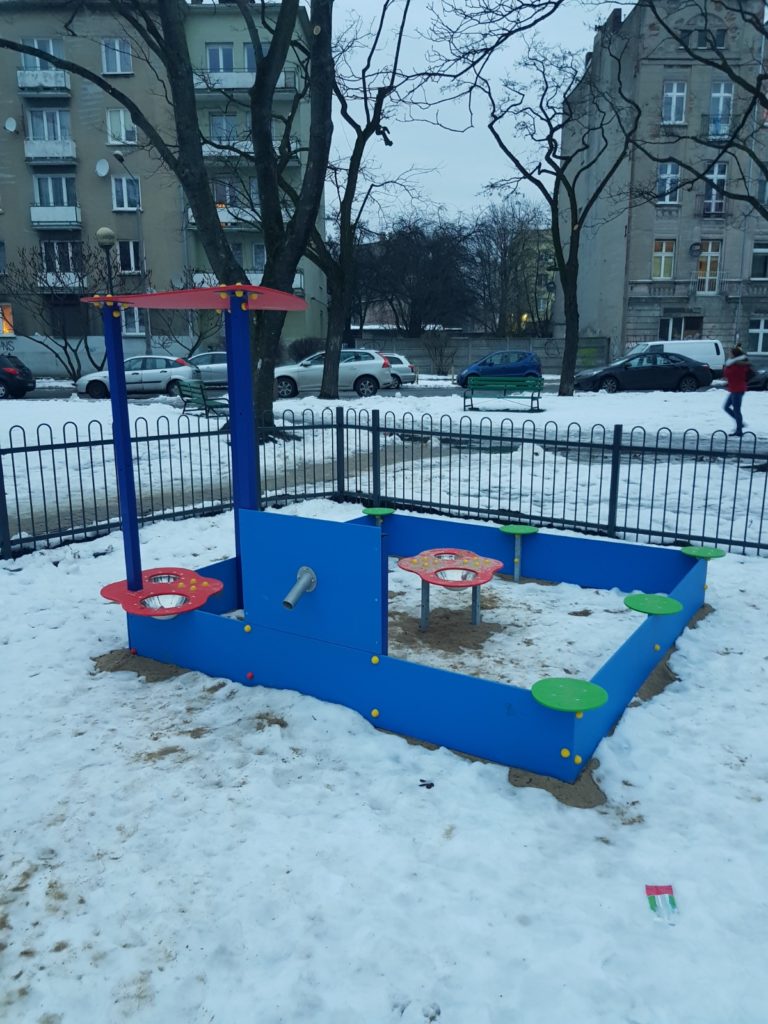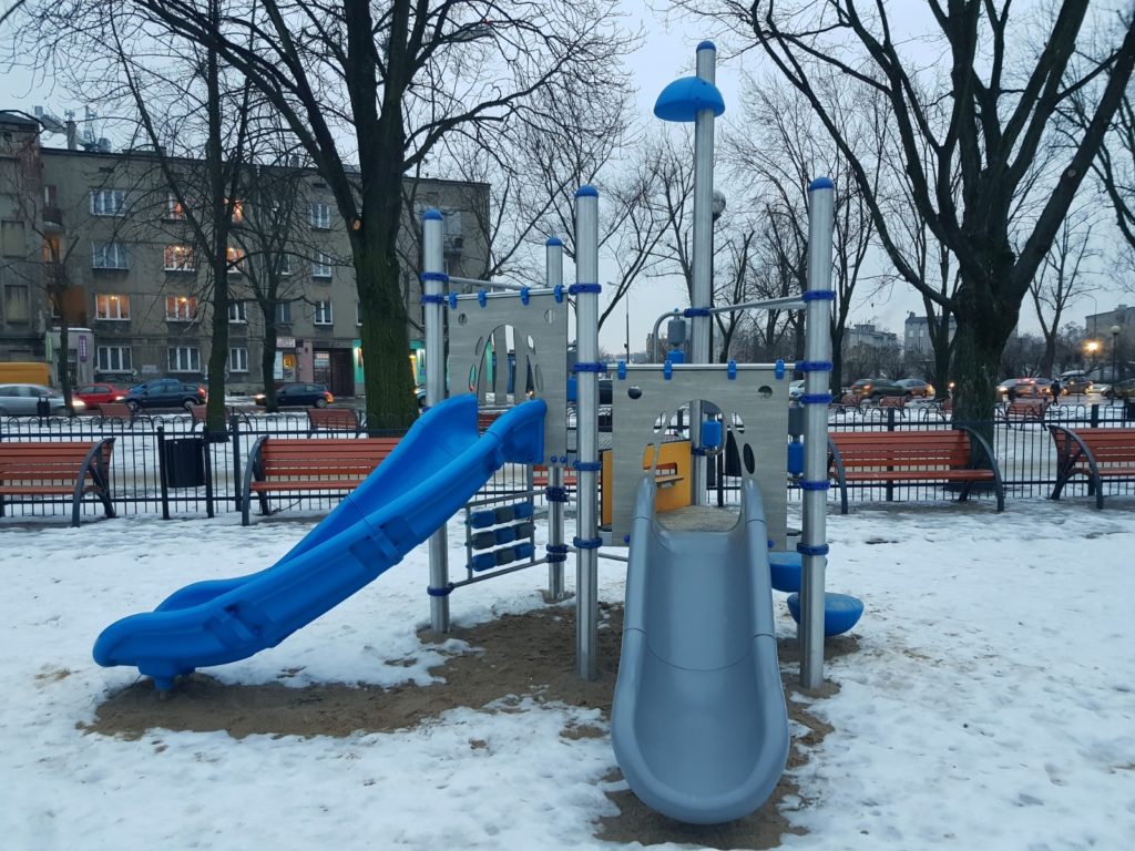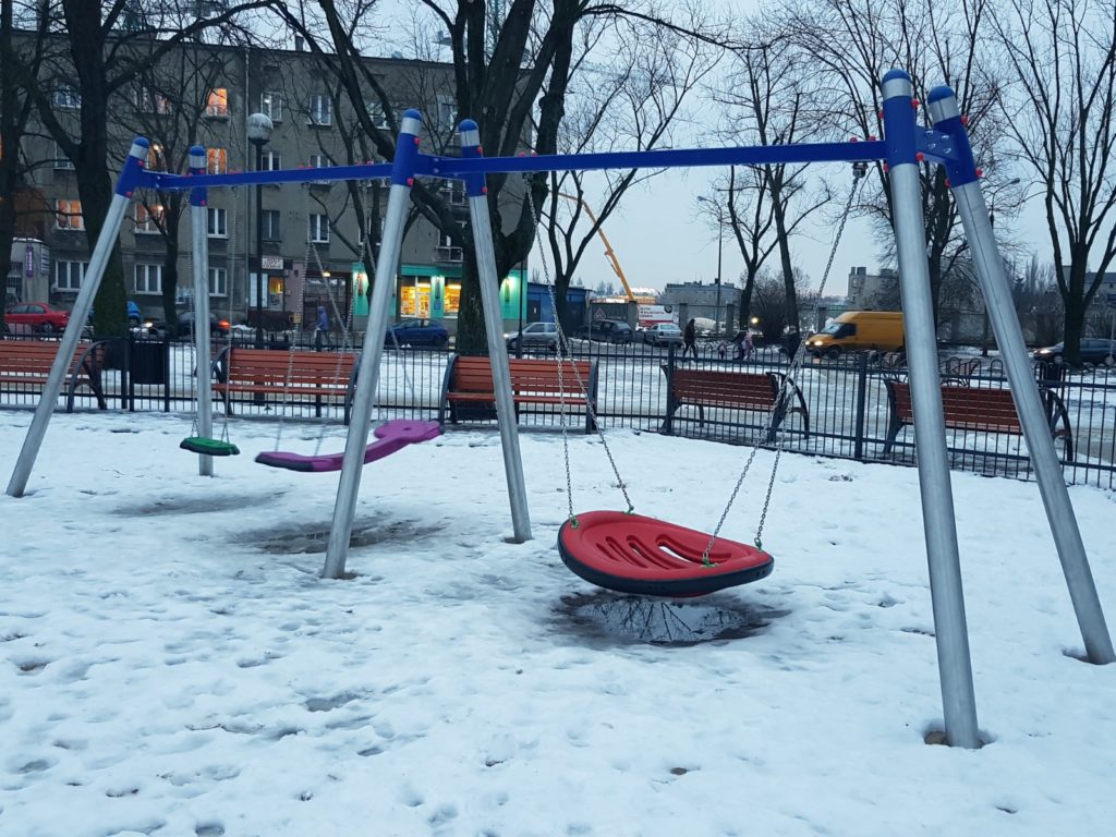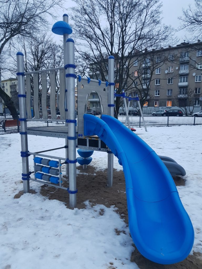 Zdjęcia poniżej pochodzą z oddania placu zabaw zimą. Czekamy na wiosnę kiedy zobaczymy go w otoczeniu zieleni. Dzieci z Łodzi też czekają aż zrobi się cieplej i będą mogły do woli spędzać czas na zjeżdżalniach, huśtawkach i mostach.