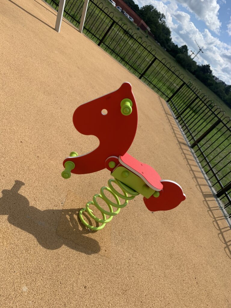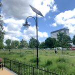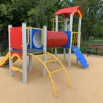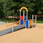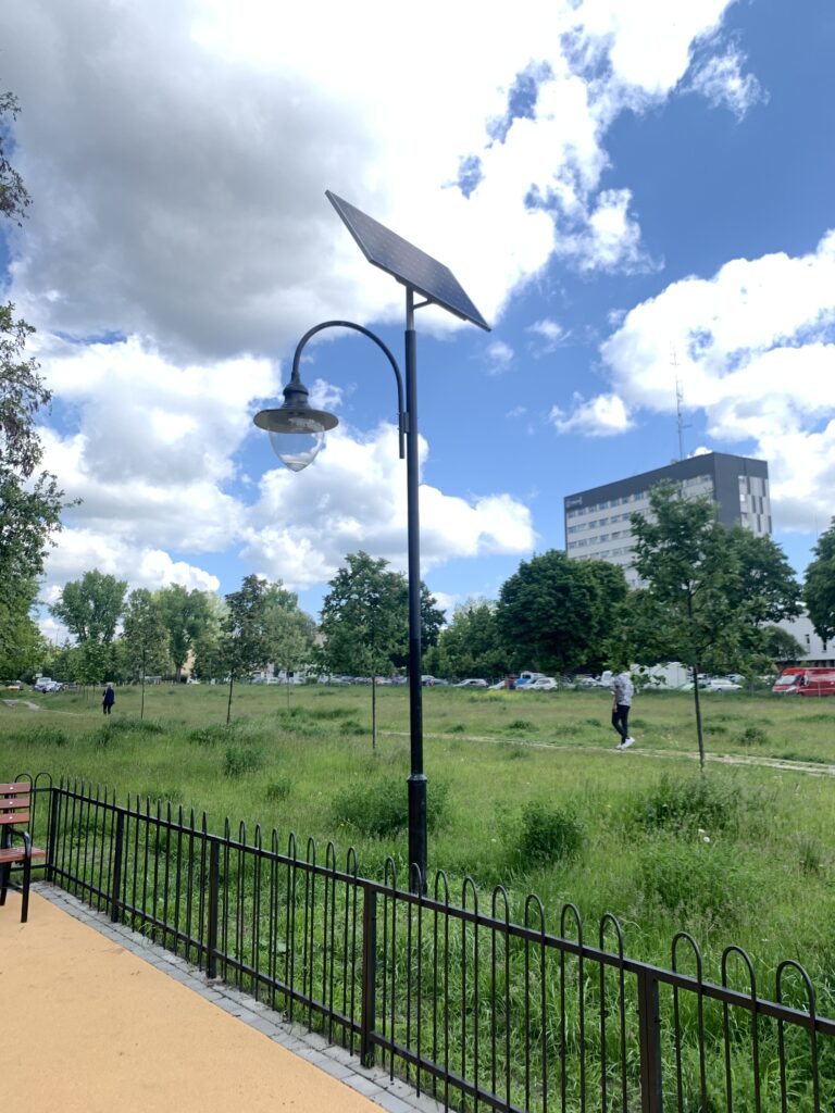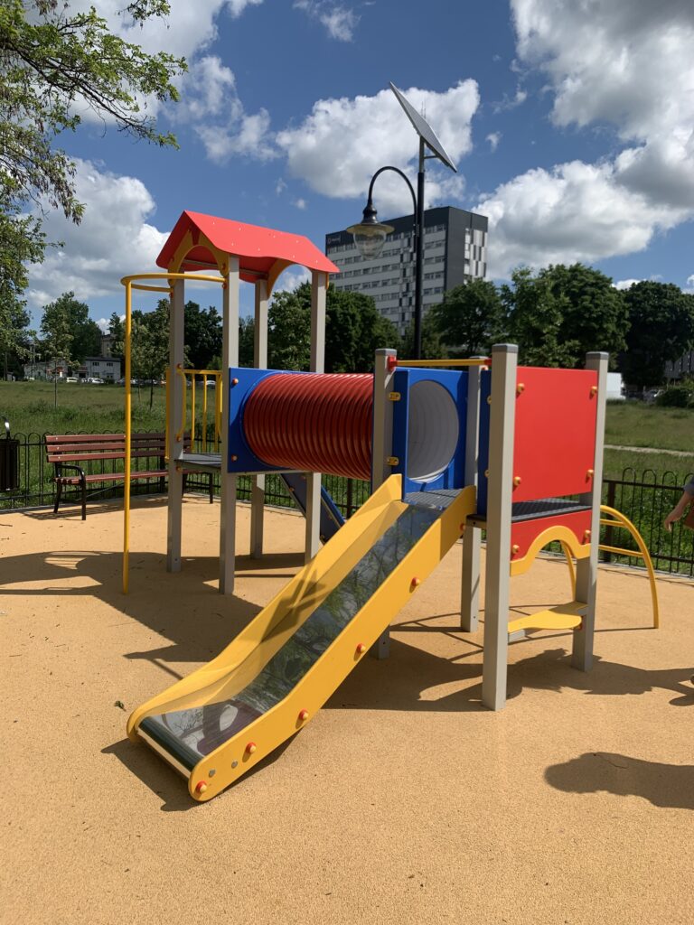 Wykonaliśmy bezpieczną nawierzchnię wylewaną w kolorze piaskowym. Zainstalowaliśmy również panele solarne przy latarni.