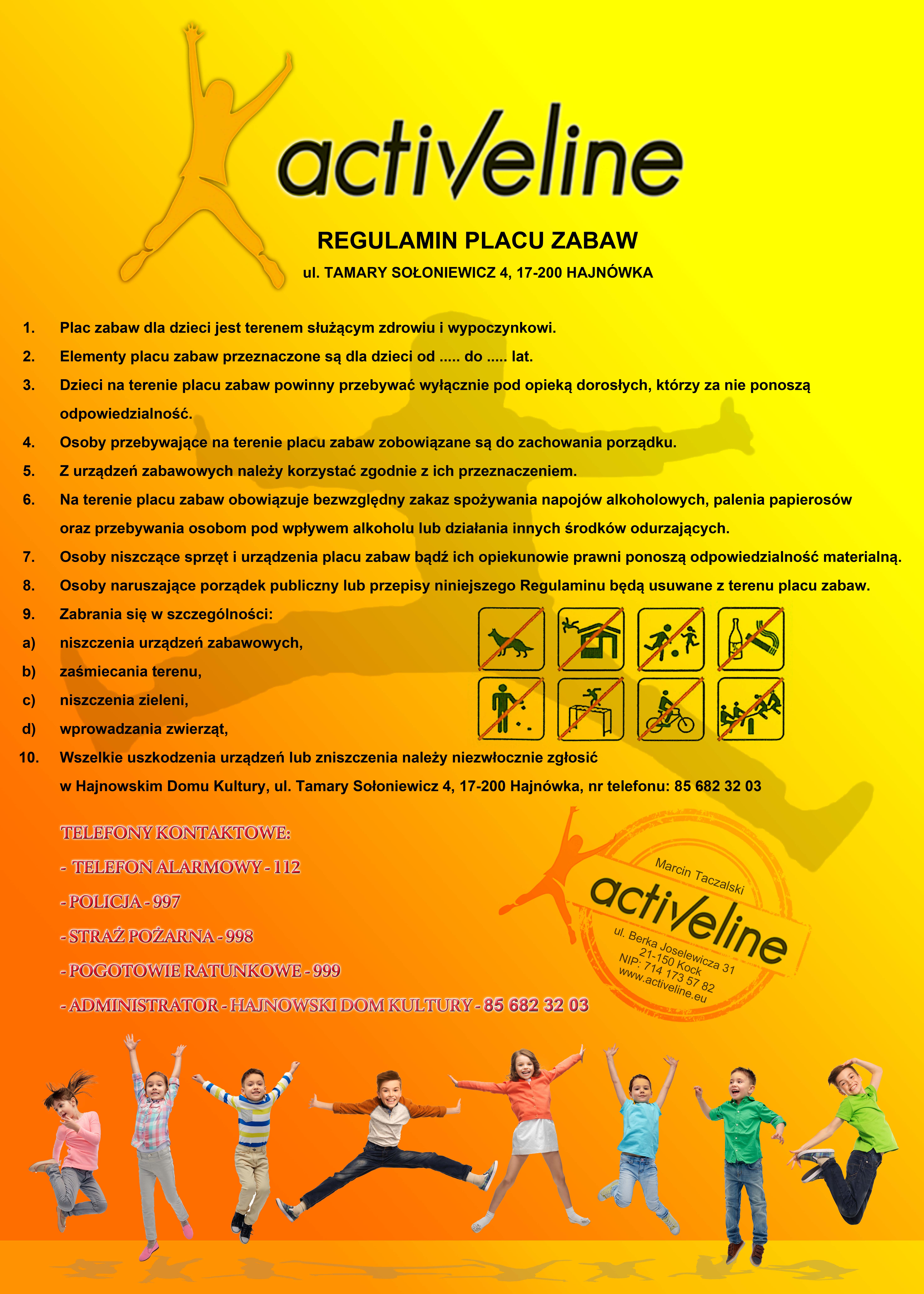 - Dane kontaktowe do właściciela / zarządcy / administratora placu zabaw.